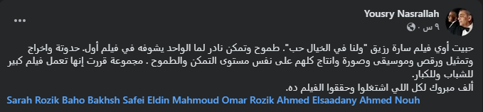 وكتب المخرج يسري نصر الله، منشورا يشيد من خلاله بفيلم ولنا في الخيال حب، وفقا لما رصده موقع تحيا مصر، عبر صفحته الرسمية على موقع التواصل الاجتماعي فيسبوك، وقال فيه: حبيت أوي فيلم سارة رزيق "ولنا في الخيال حب"، طموح وتمكن نادر لما الواحد يشوفه في فيلم أول حدوتة واخراج وتمثيل ورقص وموسيقى وصورة وانتاج كلهم على نفس مستوى التمكن والطموح، مجموعة قررت إنها تعمل فيلم كبير للشباب وللكبار، ألف مبروك لكل اللي اشتغلوا وحققوا الفيلم ده.