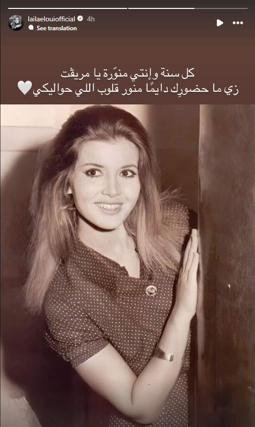 وشاركت الفنانة ليلى علوي، صورة للفنانة ميرفت أمين بمناسبة عيد ميلادها، وفقا لما رصده موقع تحيا مصر، وذلك عبر خاصية استوري صفحتها الرسمية على موقع التواصل الاجتماعي إنستجرام، وكتبت عليها: كل سنة وانت منورة يا ميرفت، زي ما حضورك دايما منور كل اللي حواليكي.