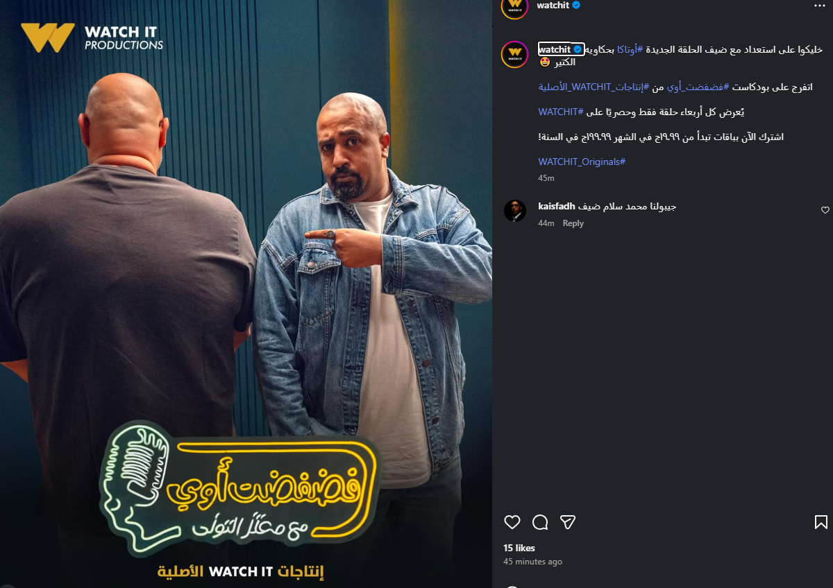 وشارك منصة watch it، البوستر الخاض بحلقة الفنان محمد أوتاكا، وفقا لما رصده موقع تحيا مصر، عبر صفحتها الرسمية على موقع التواصل الاجتماعي إنستجرام، وعلقات علية: خليكوا على استعداد مع ضيف الحلقة الجديدة أوتاكا، بحكاويه الكتير، في بودكاست فضفضت أوي من إنتاجات watch it يعرض كل أربعاء حلقة فقط وحصريا على watch it.