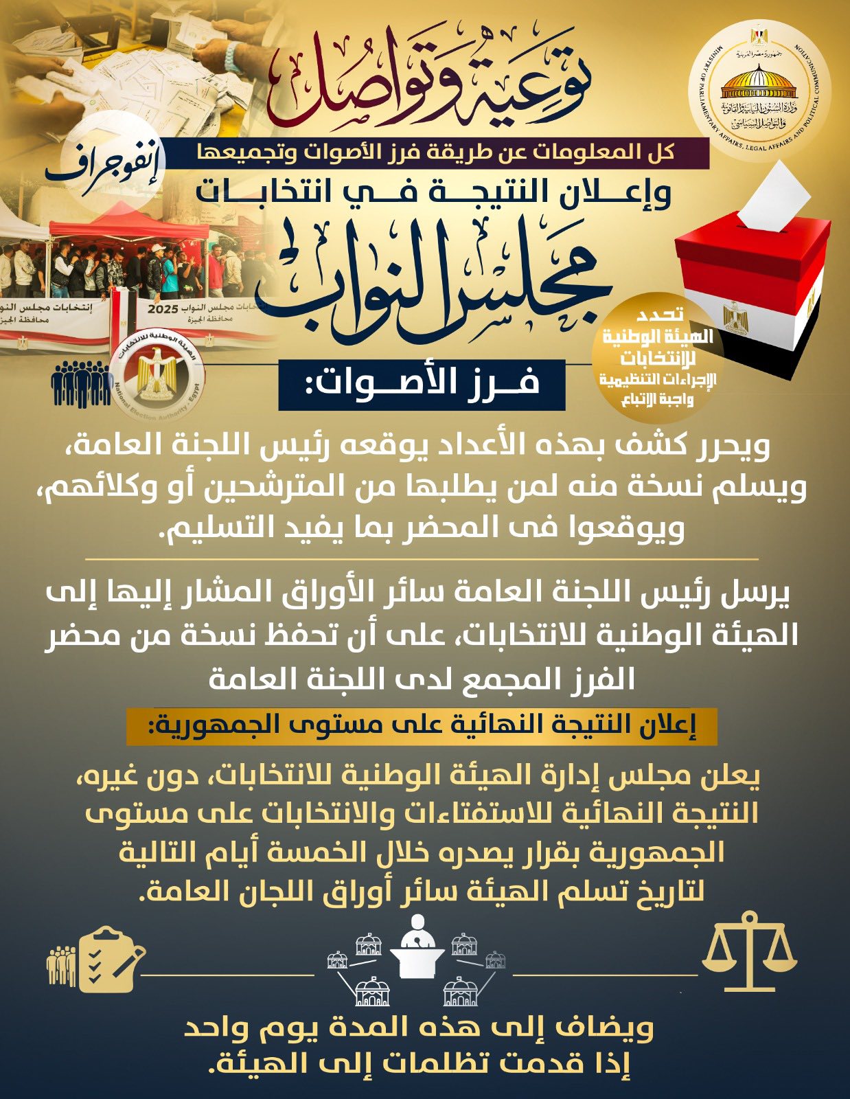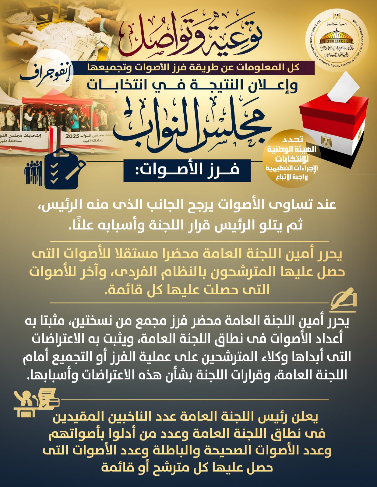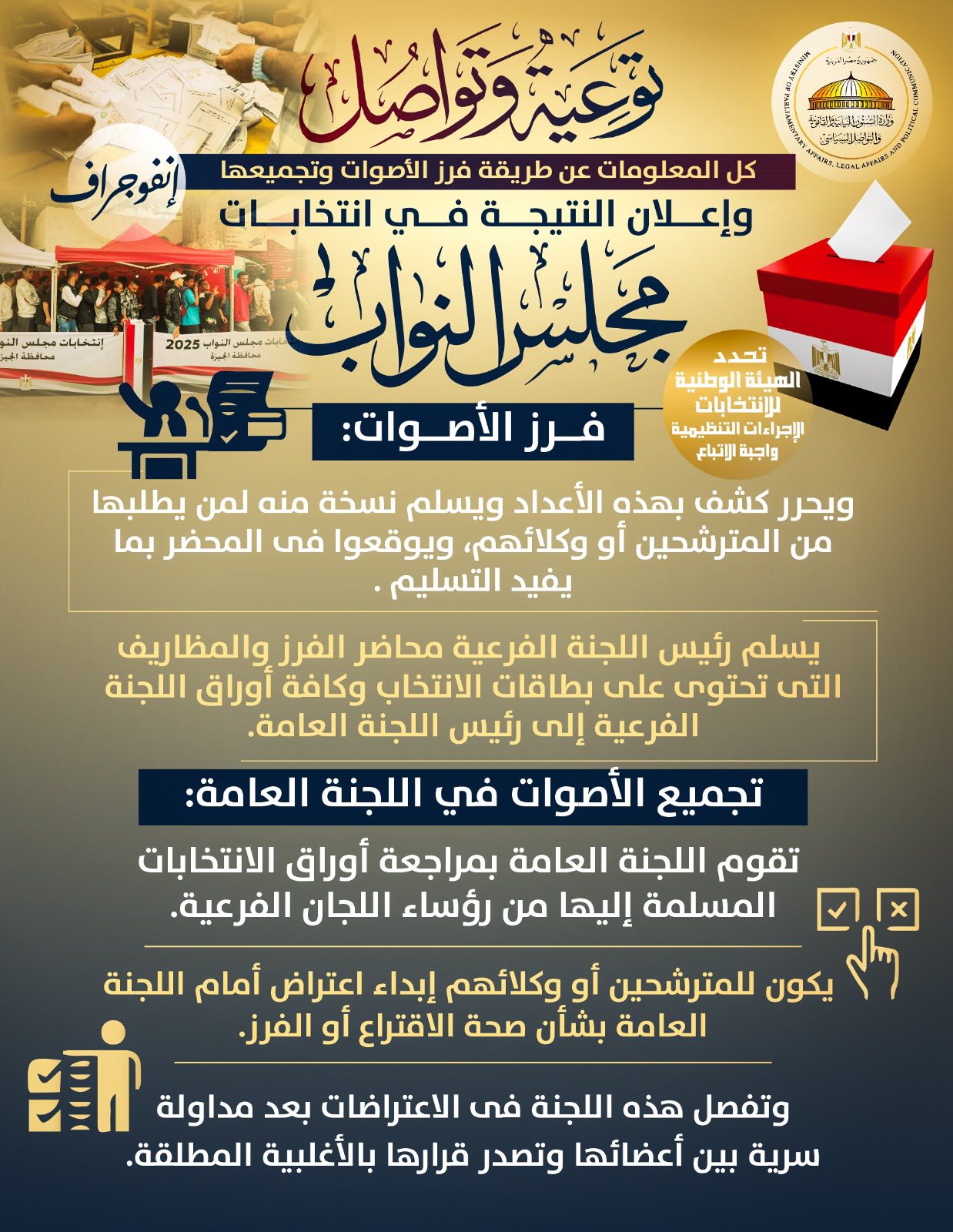 نشرت وزارة الشئون النيابية والقانونية والتواصل السياسي إنفوجرافًا توضح فيه كيفية فرز وتجميع أصوات الناخبين في انتخابات مجلس النواب الحالية وفق ضوابط الهيئة الوطنية للانتخابات.