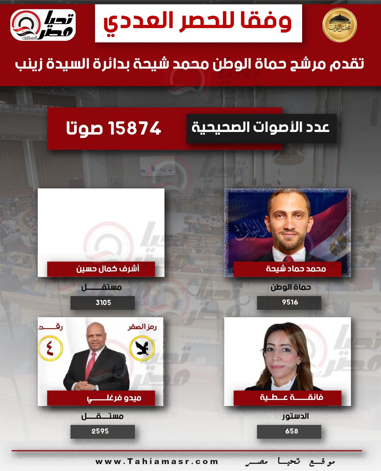 كشف الحصر العددي بانتخابات مجلس النواب في دائرة السيدة زينب بمحافظة القاهرة عن تفوق واضح للمترشح محمد حمادة شيحة مرشح حزب حماة الوطن عن باقي المترشحين في الدائرة.