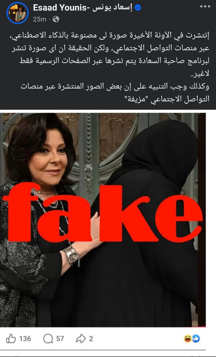 نشرت الفنانة إسعاد يونس صورة لها من برنامج صاحبة السعادة تجمعها بسيدة بعباءة تقف بالخلف دون الكشف عن هويتها كالمعتاد من طريقة إسعاد يونس في الكشف عن ضيفها في برنامجها، وعلقت إسعاد يونس عبر حسابها الرسمي على موقع تبادل الصور والفيديوهات انستجرام مؤكدة أن الصورة مصنوعة بالذكاء الاصطناعي وليس لها أساس من الصحة، وقالت في منشورها الذي رصده موقع تحيا مصر: "إنتشرت في الآونة الأخيرة صورة لى مصنوعة بالذكاء الاصطناعي، عبر منصات التواصل الاجتماعي، ولكن الحقيقة ان اى صورة تنشر لبرنامج صاحبة السعادة يتم نشرها عبر الصفحات الرسمية فقط لاغير.. وكذلك وجب التنبيه على إن بعض الصور المنتشرة عبر منصات التواصل الاجتماعي "مزيفة".