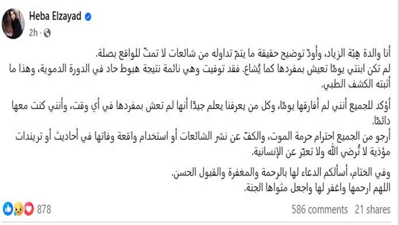 وكتبت والدة الإعلامية هبة الزياد، منشورا تنفي خلاله الشائعات التي تم تداولها حول وفاة ابنتها، وفقا لما رصده موقع تحيا مصر، وذلك عبر صفحتها الرسمية على موقع التواصل الاجتماعي فيسبوك، قائلة: أنا والدة هِبَة الزياد، وأودّ توضيح حقيقة ما يتمّ تداوله من شائعات لا تمتّ للواقع بصلة، لم تكن ابنتي يومًا تعيش بمفردها كما يُشاع. فقد توفيت وهي نائمة نتيجة هبوط حاد في الدورة الدموية، وهذا ما أثبته الكشف الطبي.