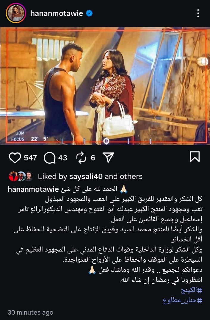 نشرت الفنانة حنان مطاوع عبر حسابها الرسمي على موقع تبادل الصور والفيديوهات منشور علقت فيه على الحادث قائلة وفقًا لما رصد موقع تحيا مصر: "الحمد لله على كل شيء، كل الشكر والتقدير للفريق الكبير على التعب والمجهود المبذول، تعب ومجهود المنتج الكبير عبدالله أبو الفتوح ومهندس الديكور الرائع تامر إسماعيل وجميع القائمين على العمل. والشكر أيضًا للمنتج محمد السيد وفريق الإنتاج على التضحية للحفاظ على أقل الخسائر، وكل الشكر لوزارة الداخلية وقوات الدفاع المدني على المجهود العظيم في السيطرة على الموقف والحفاظ على الأرواح المتواجدة. دعواتكم للجميع.. وقدر الله وما شاء فعل، انتظرونا في رمضان إن شاء الله."