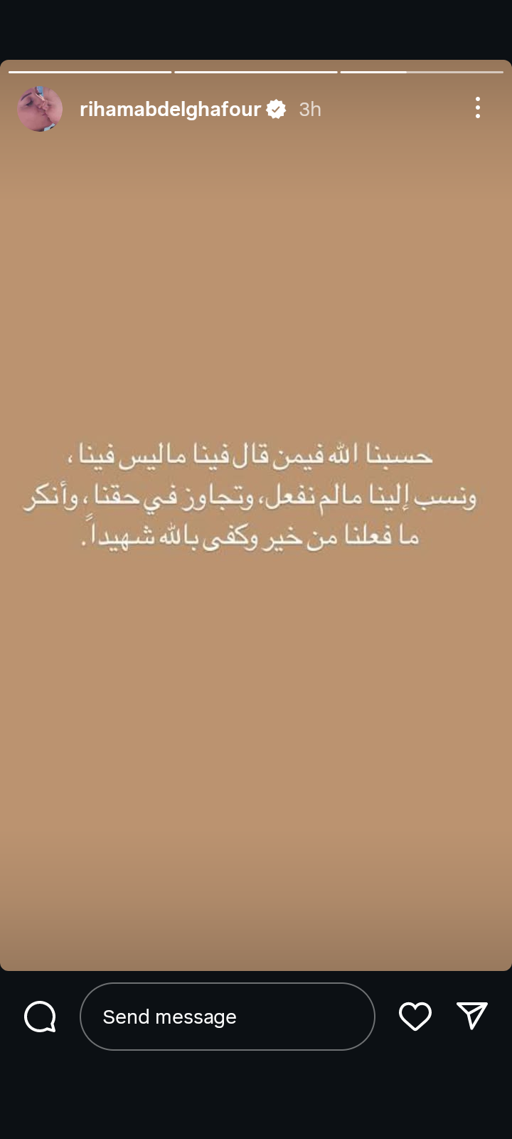 وقالت ريهام عبد الغفور في منشور رصده موقع تحيا مصر: "حسبنا الله فيمن قال فينا ما ليس فينا، ونسب إلينا ما لم نفعل، وتجاوز في حقنا، وأنكر ما فعلنا من خير، وكفى بالله شهيدا".