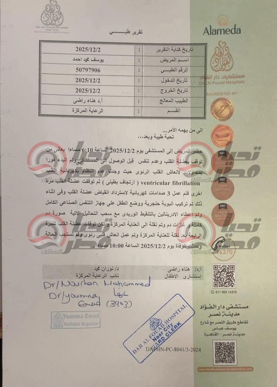 يستمر البحث عن تفاصيل الساعات الأخيرة في حياة السباح يوسف محمد، وكشفت المستندات الطبية تفاصيل الساعات الأخيرة في حياة السباح الناشئ يوسف محمد لاعب نادي الزهور، والذي نُقل إلى المستشفى يوم 2 ديسمبر 2025 في تمام الساعة السادسة وعشر دقائق مساءً، وهو في حالة حرجة بعدما وصل دون تنفس ومع توقف في عضلة القلب، وعلى الفور بدأ الفريق الطبي محاولات الإنعاش القلبي الرئوي لإنقاذ حياته، ويستعرض تحيا مصر التفاصيل.