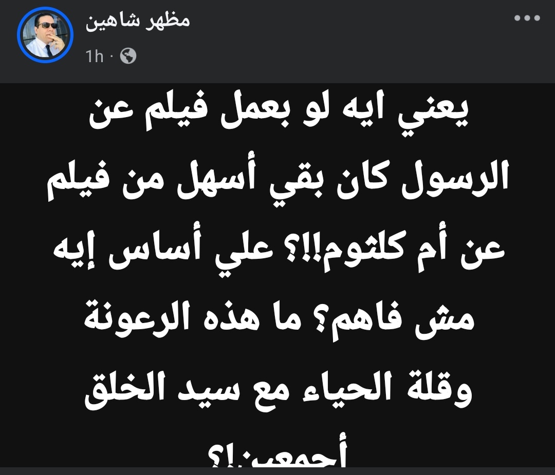 لم يتأخر ردّ الداعية مظهر شاهين، الذي كتب عبر حسابه على «فيسبوك» منشورًا شديد اللهجة رصده موقع تحيا مصر قال فيه: «يعني إيه فيلم عن الرسول هيبقى أسهل من فيلم عن أم كلثوم؟ ما هذه الرعونة وقلة الحياء مع سيد الخلق أجمعين؟»، وأكد شاهين في تعليقه أن مقام النبي ﷺ لا يجوز وضعه في أي مقارنات فنية أو بشرية مهما كانت النوايا، ومنشور شاهين انتشر بسرعة وعاد ليضع مراد في مرمى الانتقادات، بينما حاول آخرون الدفاع عنه باعتبار أن حديثه جاء مجازيًا لا يحمل نية الإساءة.