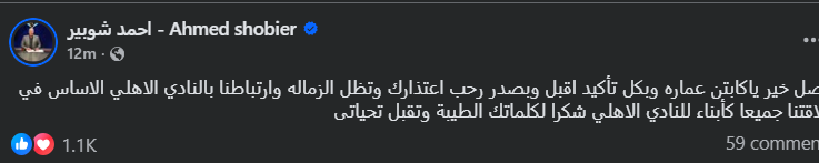 تحيا مصر، وكتب أحمد شوبير عبر حسابه الرسمي"فيس بوك": حصل خير ياكابتن عمارة، وبكل تأكيد أقبل وبصدر رحب اعتذارك وتظل الزمالة، وارتباطنا بالنادي الاهلي الأساس في علاقتنا جميعاً كأبناء للنادي الاهلي شكراً لكلماتك الطيبة وتقبل تحياتى".