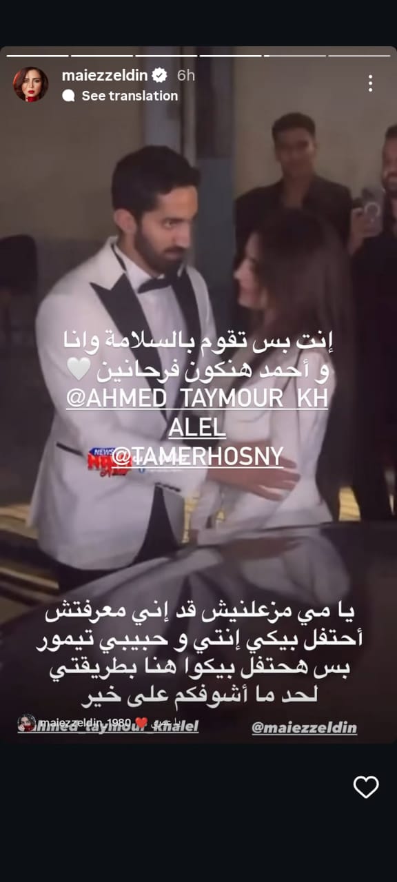 كتب تامر حسني رسالة لـ مي عز الدين في منشور رصده موقع تحيا مصر على حسابه الرسمي بموقع تبادل الصور والفيديوهات انستجرام، من خلال خاصية ستوري، جاء فيه: "يا مي مزعلنيش قد إني معرفتش احتفل بيكي انتي وحبيبي تيمور، بس هحتفل بيكوا هنا بطريقتي لحد ما أشوفكم على خير".