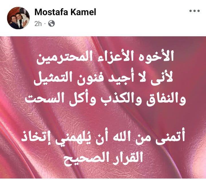 وكتب الفنان مصطفى كامل، منشورا، وفقا لما رصده موقع تحيا مصر، عبر صفحته الرسمية على موقع التواصل الاجتماعي فيسبوك بعد أزماته مع أعضاء نقابة الموسيقيين، قال فيها: لا أُجيد فنون التمثيل والنفاق والكذب وأكل السحت.. وأتمنى من الله أن يُلهمني اتخاذ القرار الصحيح.