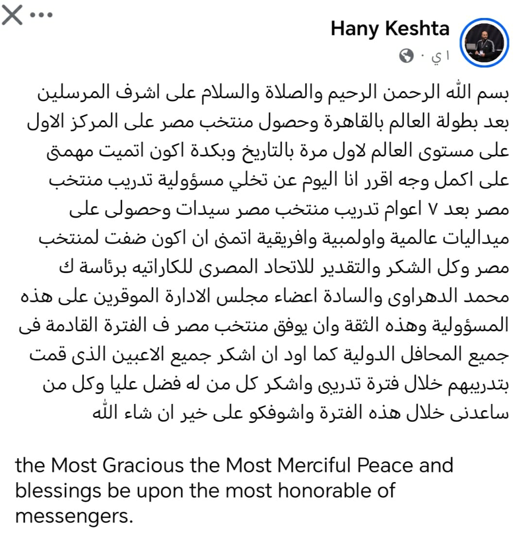 نشر هاني قشطة، مدرب منتخب مصر للآنسات في الكاراتيه، عبر حسابه على موقع «فيس بوك» بيانا أعلن فيه انتهاء مهمته مع المنتخب لأسباب غير معلومه، بعد رحلة امتدت لسبع سنوات وذلك بعد نهاية فعاليات بطولة العالم للكاراتيه 2025 والتي أقيمت في مصر.