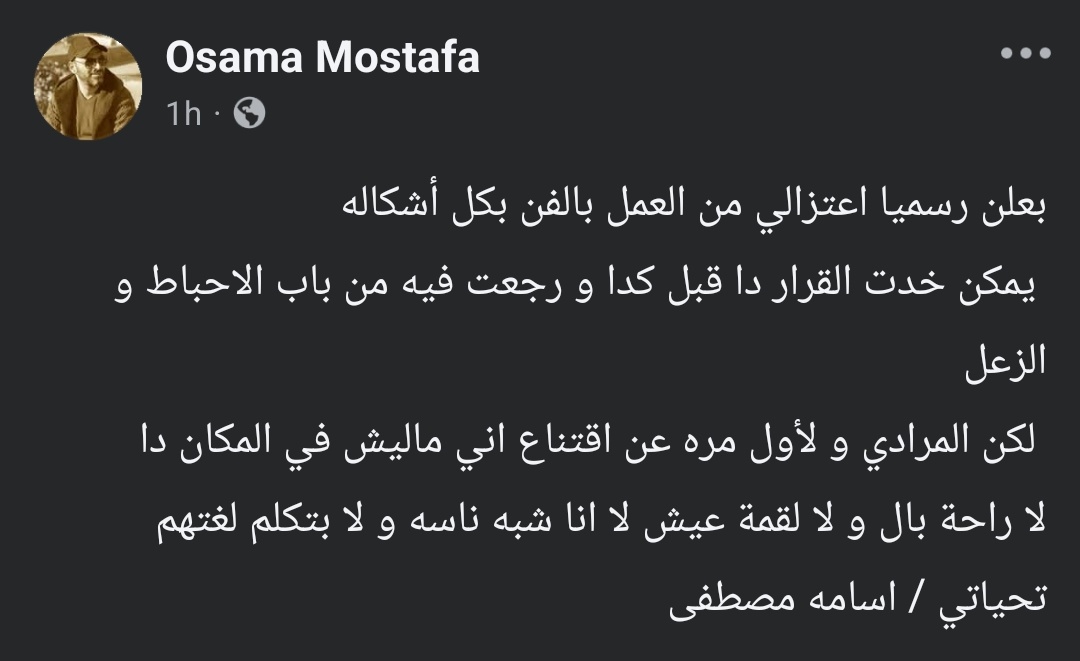 ونشر الشاعر أسامة مصطفى منشورًا عبر حسابه على موقع التواصل الاجتماعي فيسبوك والذي يرصده موقع تحيا مصر، وقال فيه: “بعلن رسميًا اعتزالي من العمل بالفن بكل أشكاله يمكن خدت القرار ده قبل كدا ورجعت فيه من باب الإحباط والزعل، لكن المرة دي، ولأول مرة، عن اقتناع إني ماليش في المكان ده، لا راحة بال ولا لقمة عيش، لا أنا شبه ناسه ولا بتكلم لغتهم.. تحياتي”، ورغم أن الجمهور اعتاد خلال الفترة الماضية تصريحات مشابهة من الشاعر الذي يُعرف بأسلوبه الحاد والصريح، فإن نبرة منشوره الأخير بدت أكثر حزمًا وإصرارًا على إنهاء علاقته بالفن، مؤكّدًا أن قراره مبني على شعور عميق بعدم الانسجام داخل الوسط.