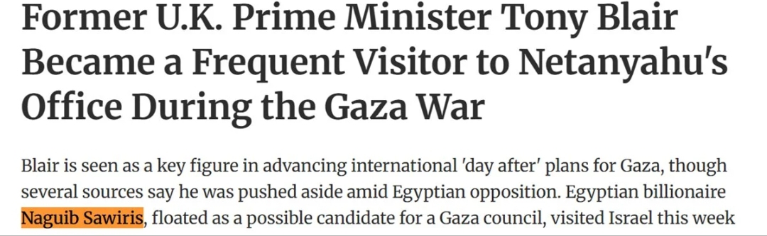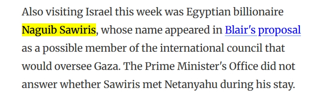 واكدت الصحيفة العبرية، أنه برز اسم ساويرس، كأحد المرشحين المحتملين للانضمام إلى المجلس الدولي المقترح، وهو المجلس الذي تضمنته خطة طرحها رئيس الوزراء البريطاني الأسبق توني بلير.
