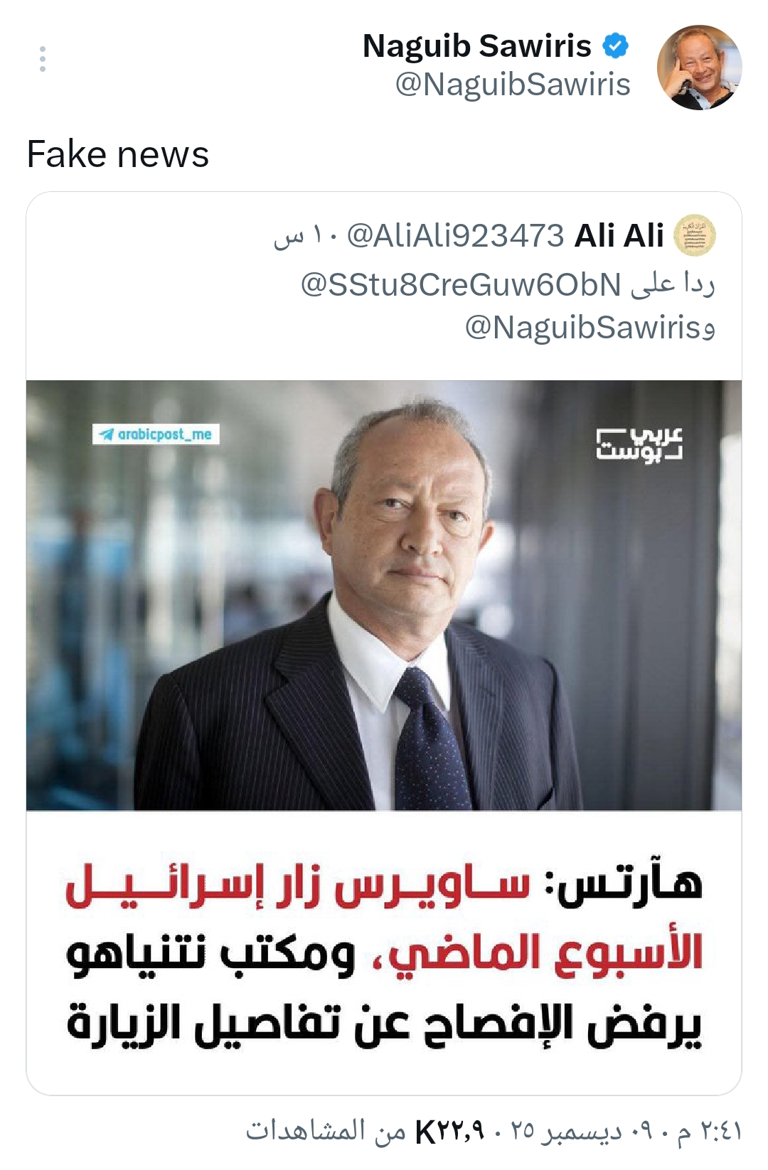 وقال نجيب ساويرس في منشور عبر صفحته على إكس: “بخصوص الخبر الخاص بزيارتي لـ تل أبيب الخبر عار من الصحة ولم يسبق لي في حياتي أن زرت تل أبيب ولا أعلم من هي الجهة التي أعلنت هذا الخبر الكاذب”.