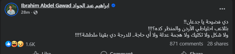 تحيا مصر، وكتب إبراهيم عبد الجواد عبر حسابه الرسمي"فيس بوك": دي فضيحة يا جدعان، بتلاعب احتياطي الأردن والمنظر كده".