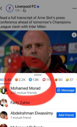 واشتعلت التعليقات الغاضبة على صور ومقاطع المدرب المنشورة عبر فيسبوك، مرفقة برمز "أغضبني"، في تعبير واضح عن حالة الاحتقان المتصاعدة تجاه قراراته الفنية، والتي يراها الكثيرون غير منطقية، خاصة عندما يتعلق الأمر بأهم وأبرز لاعبي الفريق خلال السنوات الأخيرة.