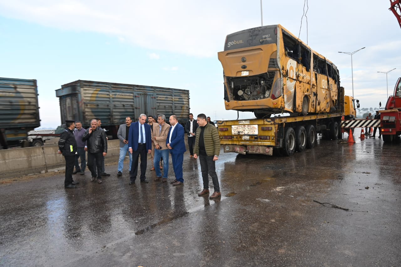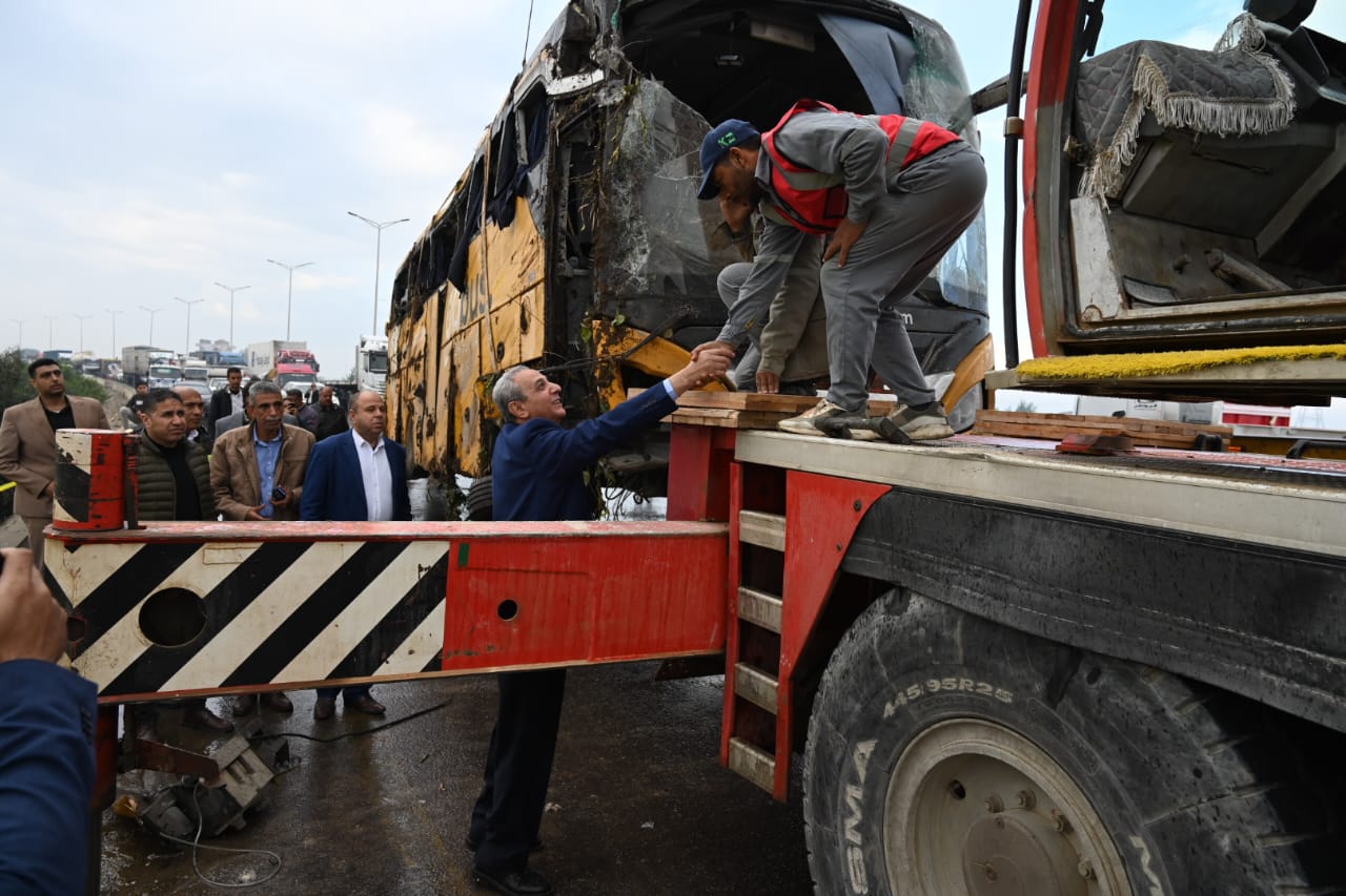 وتابع المحافظ بنفسه أعمال رفع الأتوبيس ونقله لتأمين الطريق وإعادة الحركة المرورية تدريجياً، موجهاً جميع الجهات بالعمل المتواصل حتى إزالة أي آثار للحادث.
