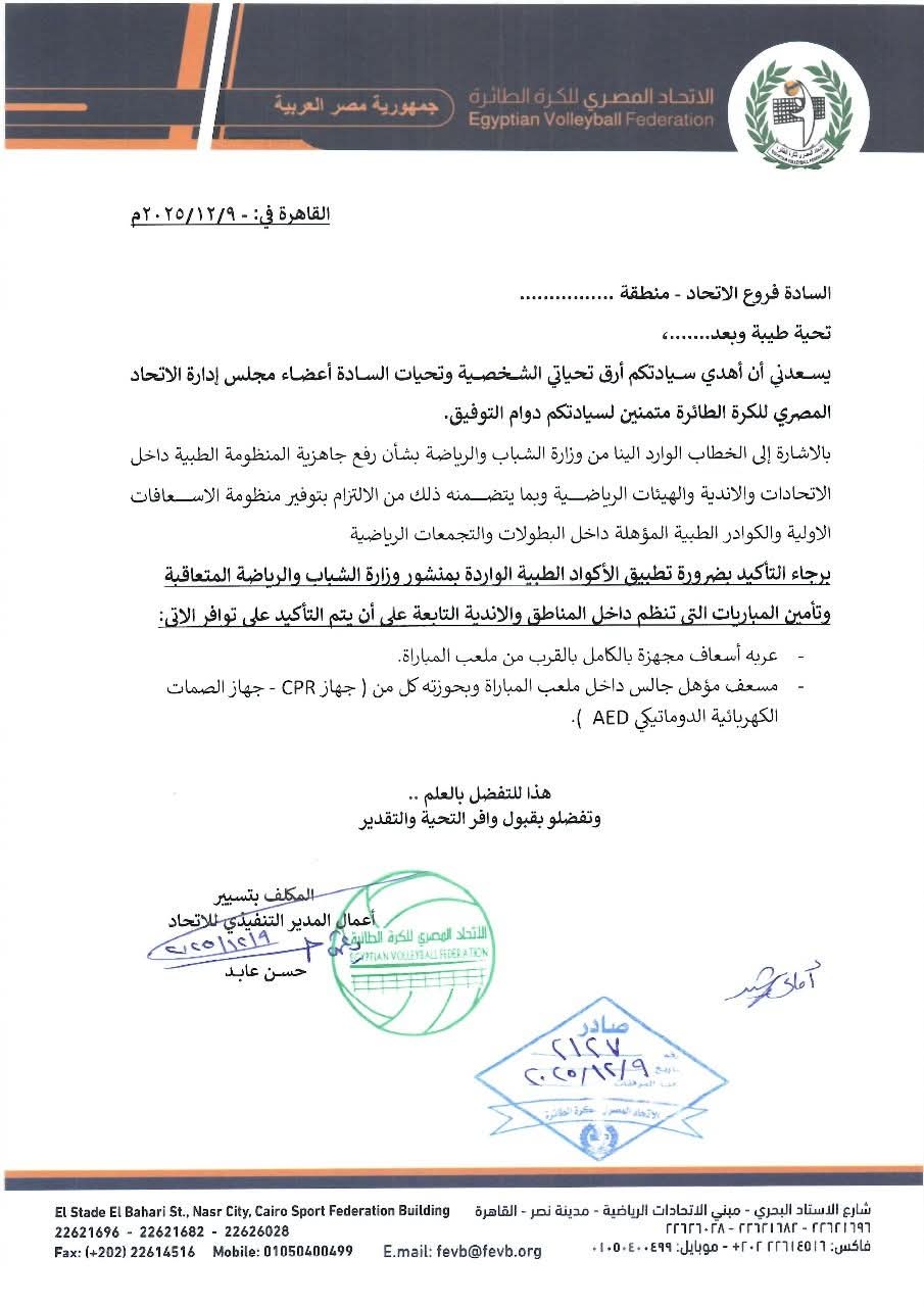 أرسل الاتحاد المصري للكرة الطائرة خطاباً إلى فروعه بالمناطق المختلفة، أكد خلاله ضرورة رفع جاهزية المنظومة الطبية داخل الاتحادات والأندية والهيئات الرياضية، تنفيذاً لتعليمات وزارة الشباب والرياضة بشأن الالتزام بتوفير منظومة إسعافات أولية متكاملة وكوادر طبية مؤهلة خلال البطولات والتجمعات الرياضية، ويستعرض تحيا مصر التفاصيل.