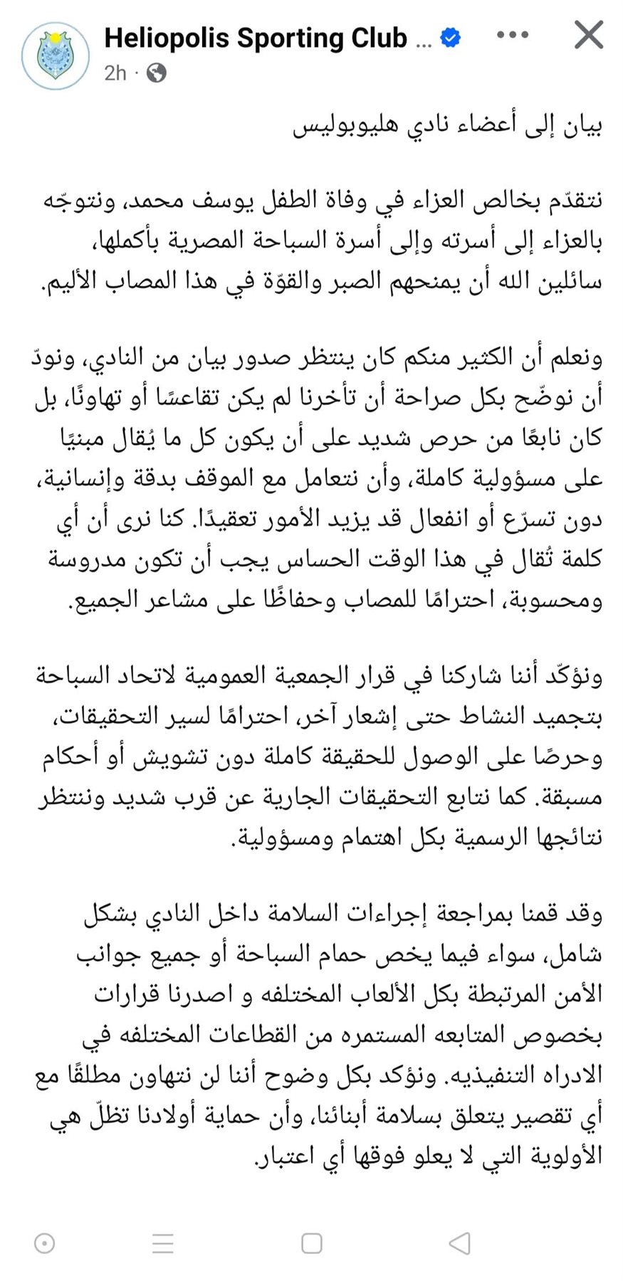 وختم النادي بيانه مؤكداً أن المسؤولية الحقيقية تظهر في الأفعال والقرارات، وأن هدف كل تصرف وكل كلمة هو أمان الأطفال وسلامتهم ومستقبلهم، مضيفًا أنه سيتم دعم الأطفال نفسيًا وتوفير بيئة آمنة تساعدهم على الاستمرار في ممارسة الرياضة بثقة واطمئنان، داعياً الله أن يرحم يوسف ويحفظ جميع اللاعبين من كل سوء، وأن تظل الرياضة مصدرًا للأمان والنجاح والنمو.