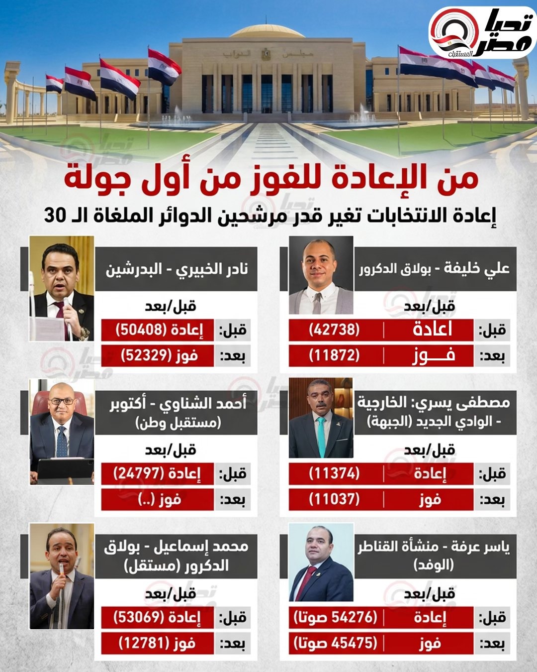 من الإعادة للفوز من أول جولة.. انتخابات الدوائر الملغاة تُغير مصير المرشحين