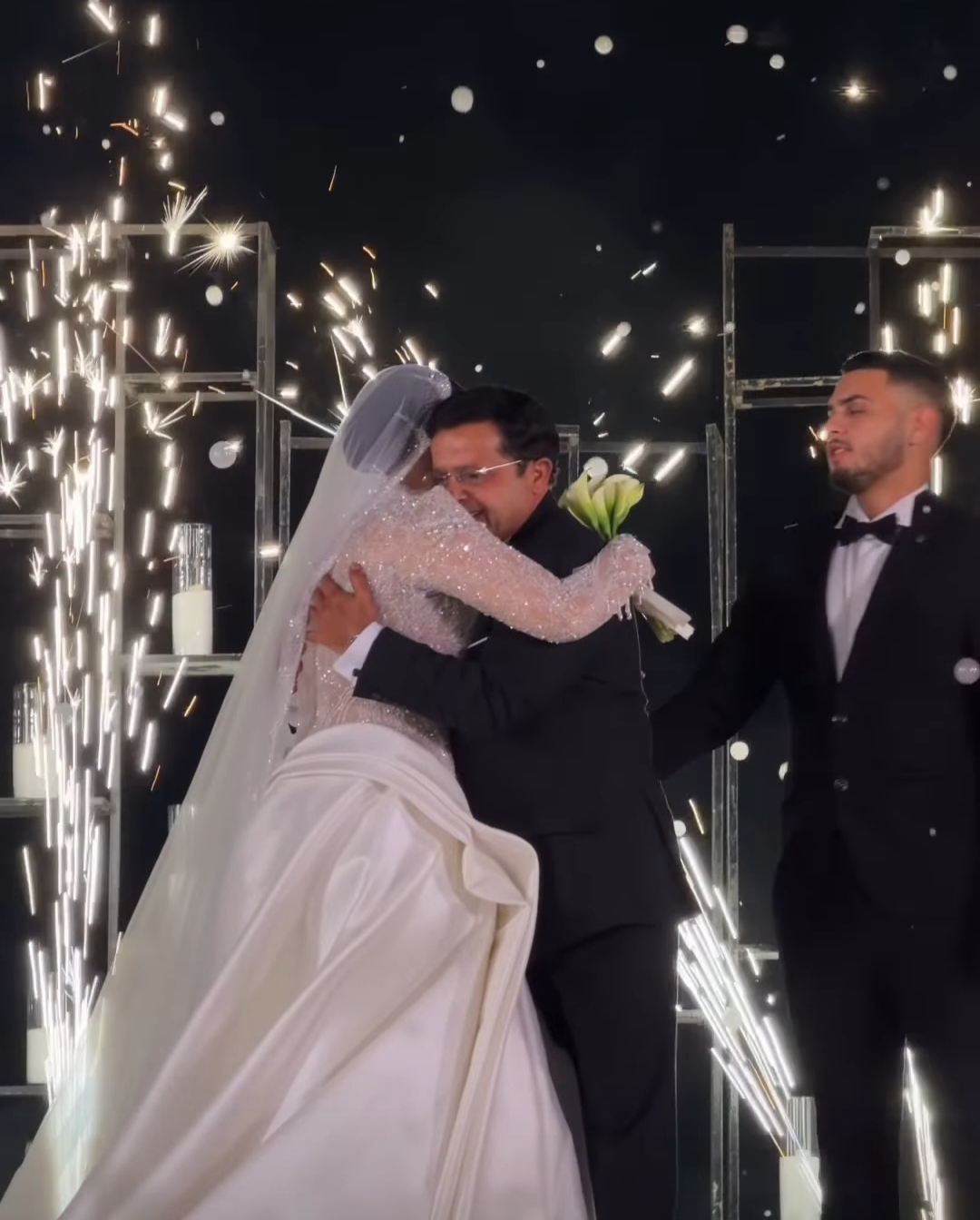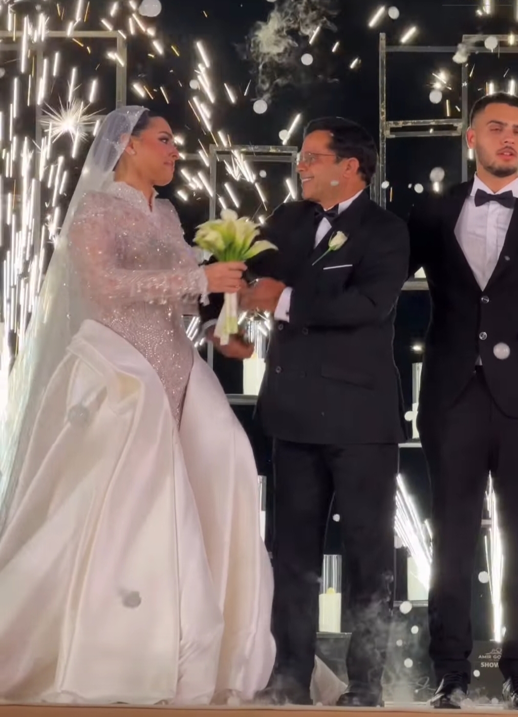 البداية كانت مع انتشار أولى الصور التي ظهر فيها الفنان محمد هنيدي يحتضن ابنته بفستان الزفاف والدموع تلمع في عينيه، في لقطة وصفتها التعليقات بأنها «أجمل مشاعر أبو العروسة» وواحدة من أكثر لقطات الليلة إنسانية، وظهرت العروس فريدة بإطلالة بسيطة ورقيقة أثارت إعجاب الجميع، حيث اعتمدت فستانًا أبيض ناعم التفاصيل، يناسب شخصيتها الهادئة، وهو ما منح الحفل لمسة من الرقي، وقد رصد «تحيا مصر» لحظات دخولها القاعة التي شهدت تفاعلًا كبيرًا، خصوصًا حين تقدّم والدها لاستقبالها بعناق مؤثر.