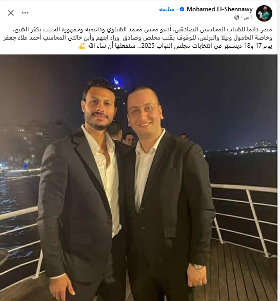 ووجه محمد الشناوي حارس مرمي الأهلي والمنتخب الوطني أهالي دائرة بيلا والحامول بمحافظة كفر الشيخ لإنتخاب المهندس أحمد علاء جعفر مرشح حزب مستقبل وطن عن الدائرة خلال جولة الإعادة للمرحلة الثانية لإنتخابات مجلس النواب 2025 عبر حسابه الرسمي بموقع التواصل الإجتماعي “فيس بوك” برسالة مضمونها:"مصر دائما للشباب المخلصين الصادقين، أدعو محبي محمد الشناوي وداعميه وجمهوره الحبيب بكفر الشيخ، وخاصة الحامول وبيلا والبرلس، للوقوف بقلب مخلص وصادق وراء ابنهم وأبن خالتي المحاسب أحمد علاء جعفر يوم 17 و18 ديسمبر في انتخابات مجلس النواب 2025... سنفعلها أن شاء الله."