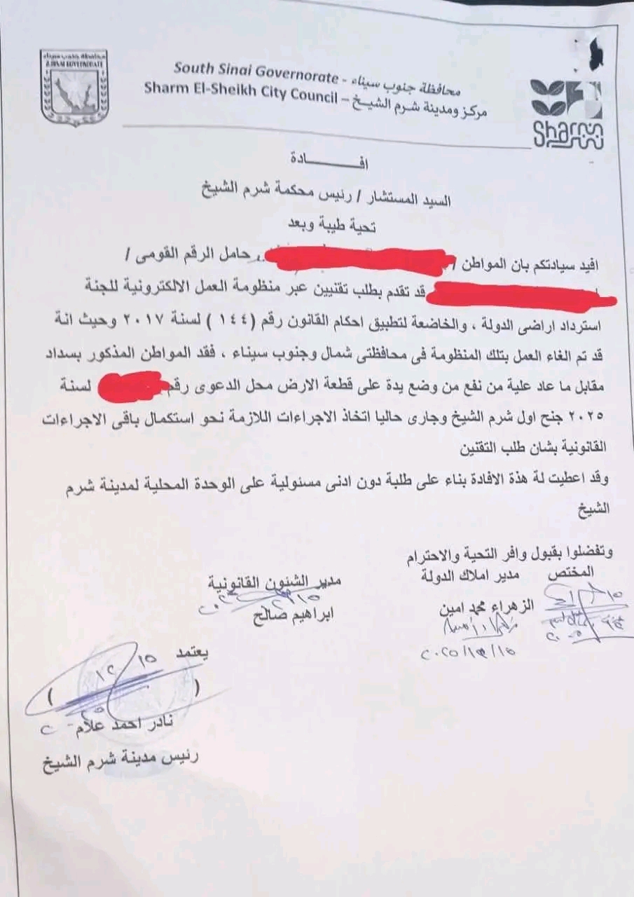 وبفضل هذه التنسيقات، سمح المحافظ بإجراء استثنائي يتيح للمتضررين التوجه إلى مجلس مدينة شرم الشيخ وكتابة إقرار بالسير في إجراءات التقنين، واستكمال الأوراق، ودفع ما تبقى من المستحقات، واستلام إفادة تفيد بسير إجراءات التقنين لتقديمها للمحكمة لحين استكمال الإجراءات.