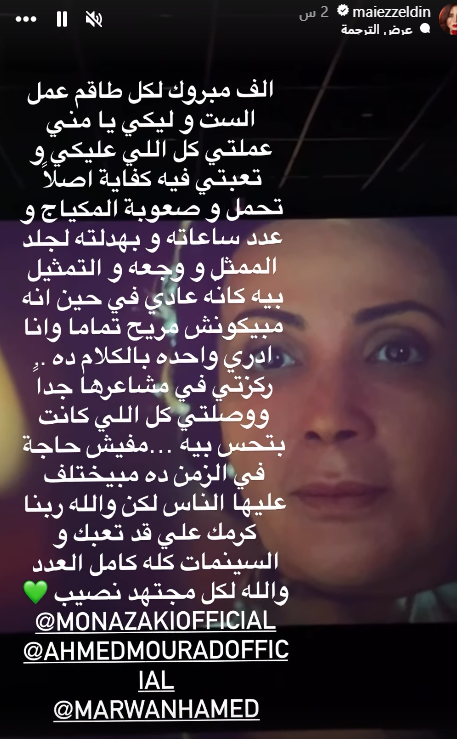 وكتبت الفنانة مي عز الدين رسالة مؤثرة أشادت خلالها بأداء منى زكي، مؤكدة أن ما قدمته في الفيلم لم يكن سهلًا على الإطلاق، سواء من حيث التحضير أو التفاصيل الدقيقة التي لا يلتفت إليها الكثيرون، وقالت مي عز الدين في رسالتها: “الف مبروك لكل طاقم عمل الست و ليكي يامنى عملتي كل اللي عليكي و تعبتي فيه، كفاية تحمل وصعوبة المكياج و عدد ساعاته وبهدلته لجلدك ووجعه وانا ادرى واحده بالكلام ده”.