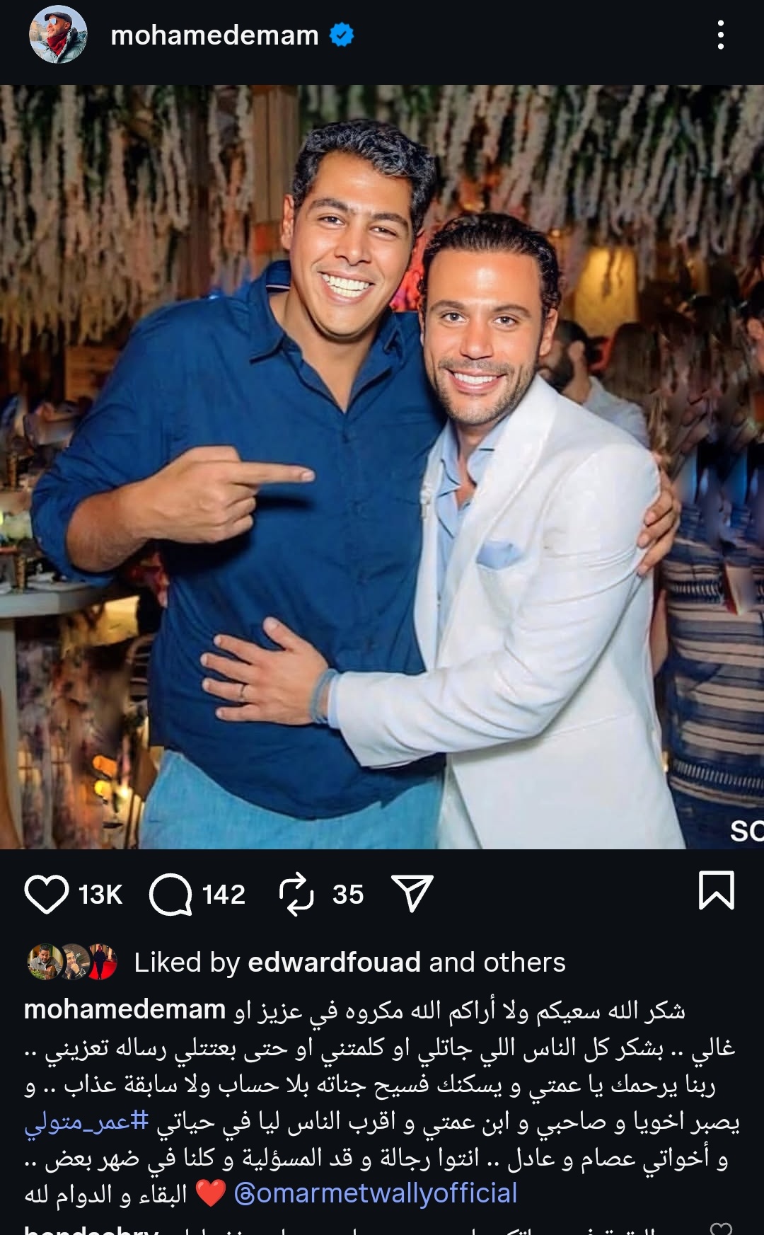 وخص محمد إمام بالدعاء والدعم ابن عمته الفنان عمر مصطفى متولي، مؤكدًا أنه أخ وصديق وأقرب الأشخاص إليه في حياته، إلى جانب شقيقيه عصام وعادل، وكتب وفقا لما رصد موقع تحيا مصر معبرًا عن فخره بهم: «أنتوا رجالة وقد المسؤولية، وكلنا في ضهر بعض»، مختتمًا رسالته بجملة تعكس إيمانه بقضاء الله وقدره: «البقاء والدوام لله».