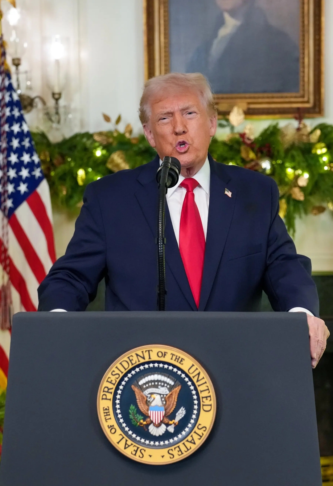 ألقى الرئيس الأمريكي دونالد ترامب خطاباً لشعبه من قاعة الاستقبال الدبلوماسي بالبيت الأبيض، استعرض فيه إنجازاته في عام 2025 وأهدافه للسنوات الثلاث المقبلة في منصبه. استغرق الخطاب نحو عشرين دقيقة.