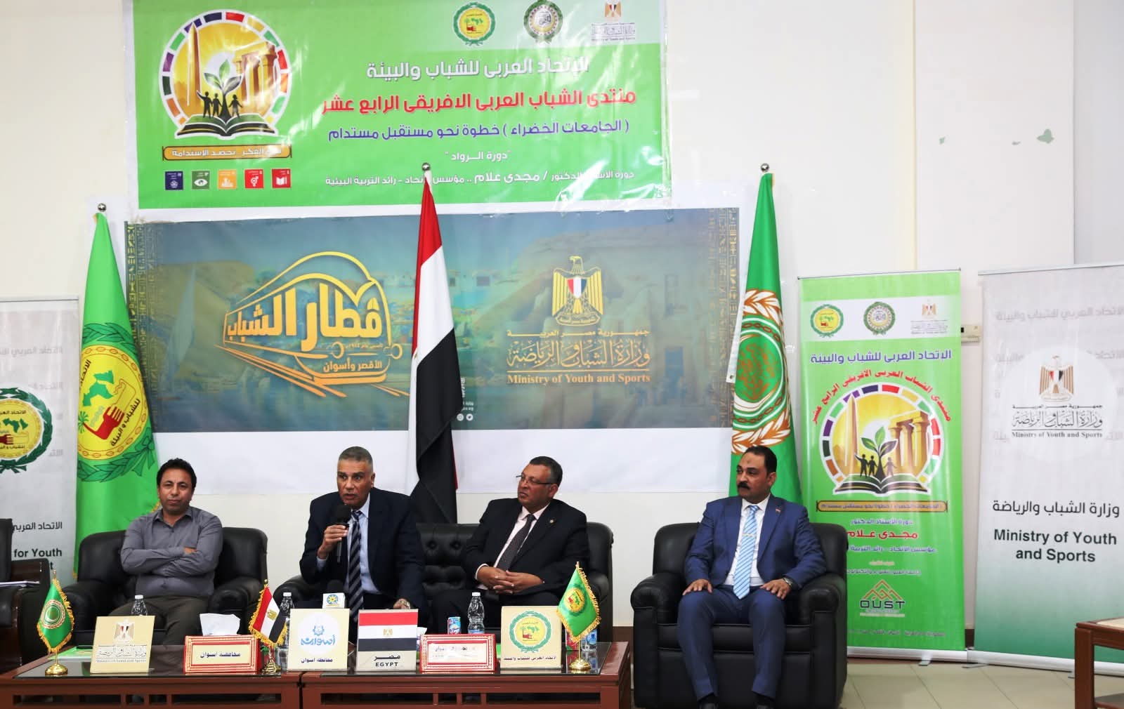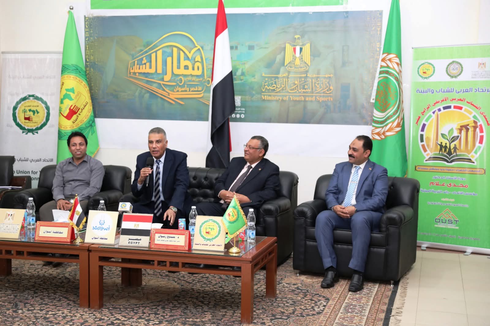 فى حوار مفتوح للواء دكتور إسماعيل كمال محافظ أسوان مع الشباب العربى والمصرى المشارك بالجلسة الختامية للمنتدى العربى الأفريقى الرابع عشر للشباب ، والذى يأتى ضمن الفوج الثانى لبرنامج " قطار الشباب - أعرف بلدك " وتنظمة وزارة الشباب والرياضة بالتعاون مع جامعة الدول العربية ، والإتحاد العربى للشباب والبيئة ، ويقام المنتدى بالمدينة الشبابية بأسوان تحت عنوان " دورة الخبير البيئى الدكتور مجدى علام مؤسس الإتحاد ".