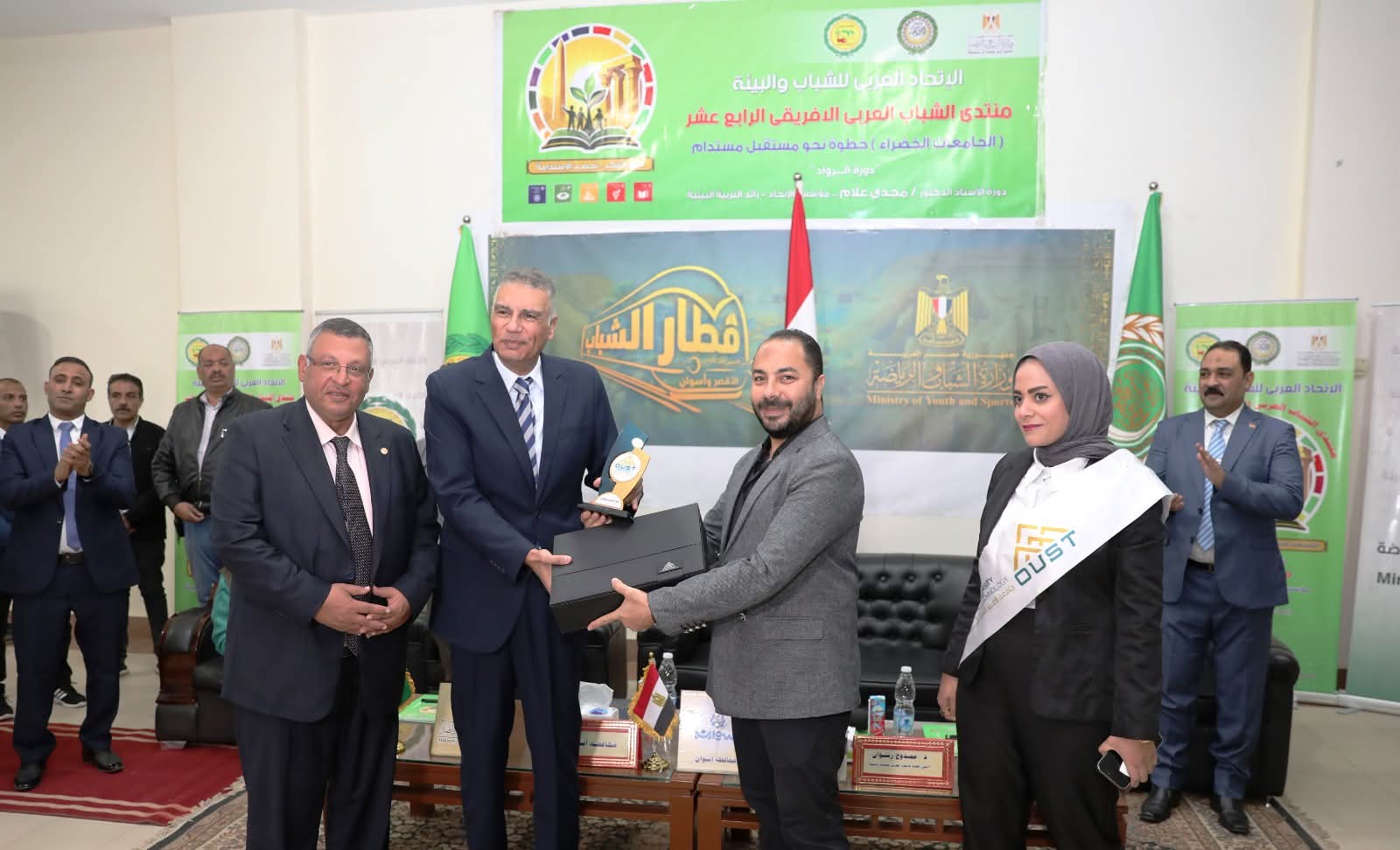 وفى ختام اللقاء تم إهداء درع الإتحاد العربى للشباب والبيئة ، ودرع جامعة العبور لمحافظ أسوان تقديراً على دعمه للجهود والأنشطة الشبابية ، فيما حرص المحافظ على إلتقاط الصور التذكارية مع أبناؤه الشباب والوفود المشاركة تعبيراً عن ترحيب المحافظة بهم ، والجدير بالذكر بأن المنتدى العربى الإفريقى الرابع عشر للشباب يضم 300 شاباً وفتاة من 11 دولة عربية ، إلى جانب مشاركة علمية وأكاديمية متميزة لنحو 12 جامعة مصرية وعربية ، وقاموا بزيارات ميدانية لأبرز المعالم السياحية والأثرية والحضارية بأسوان لترسيخ الوعى بالتراث المصرى ودعم السياحة الثقافية وتعريف المشاركين بتنوع المقومات السياحية التى تتمتع بها أرض الكنانة ، وشهدت فعاليات اللقاء تقديم فقرات فنية لفرق الفنون بمديرية الشباب والرياضة .