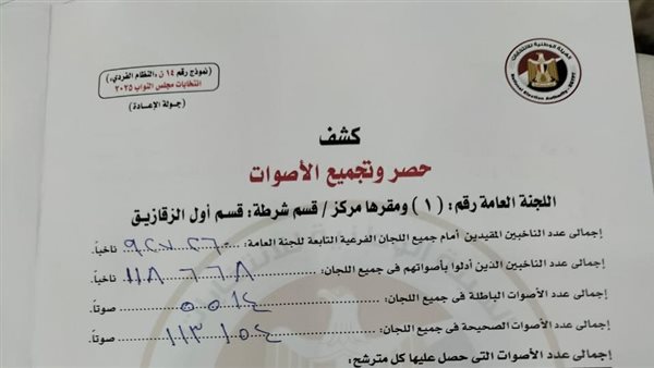 نتيجة الحصر العددي لأصوات الناخبين في جولة الإعادة بالدائرة الأولي بالزقازيق