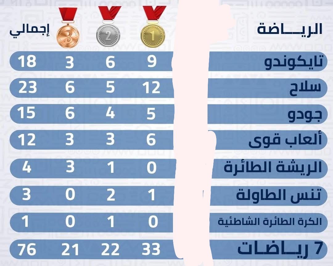 أما في السلاح، فقد شارك 23 لاعبا ولاعبة، وحققوا إنجازا كاملًا بحصد 23 ميدالية، توزعت بين 12 ذهبية، و5 فضيات، و6 برونزيات.