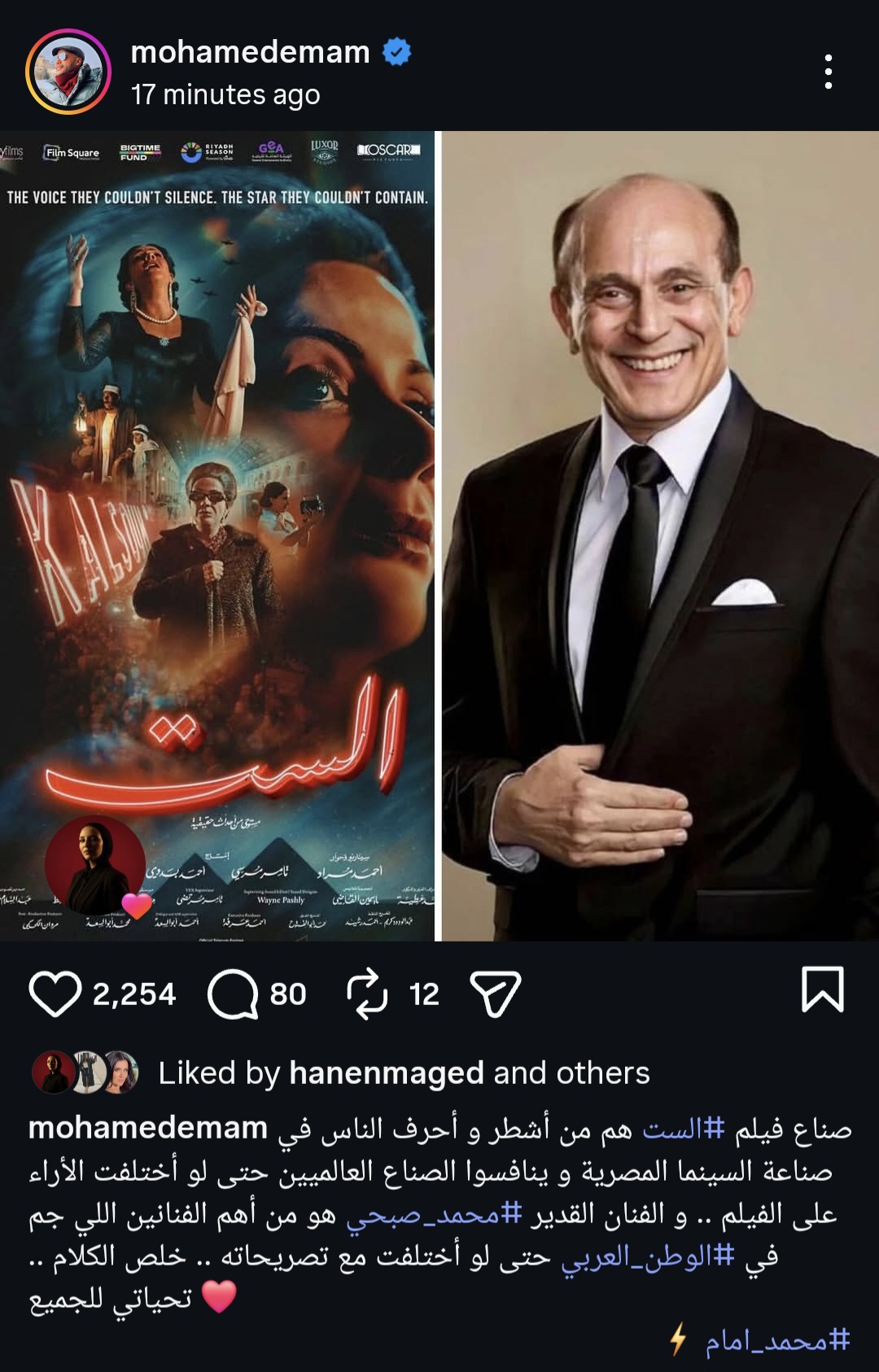 نشر الفنان محمد إمام منشورًا عبر حسابه الرسمي على موقع «إنستجرام»، عبّر فيه عن دعمه وتقديره لصُنّاع فيلم «الست»، مؤكدًا أن فريق العمل يضم نخبة من أمهر وأحرف الأسماء في صناعة السينما المصرية، وقادرين على منافسة كبار صُنّاع السينما على المستوى العالمي، حتى في ظل اختلاف الآراء حول الفيلم.