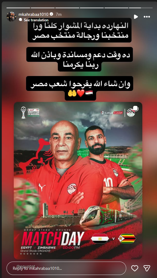 "كلنا ورا منتخبنا".. كهربا يوجه رسالة دعم لمنتخب مصر قبل مواجهة زيمبابوي في أمم أفريقيا