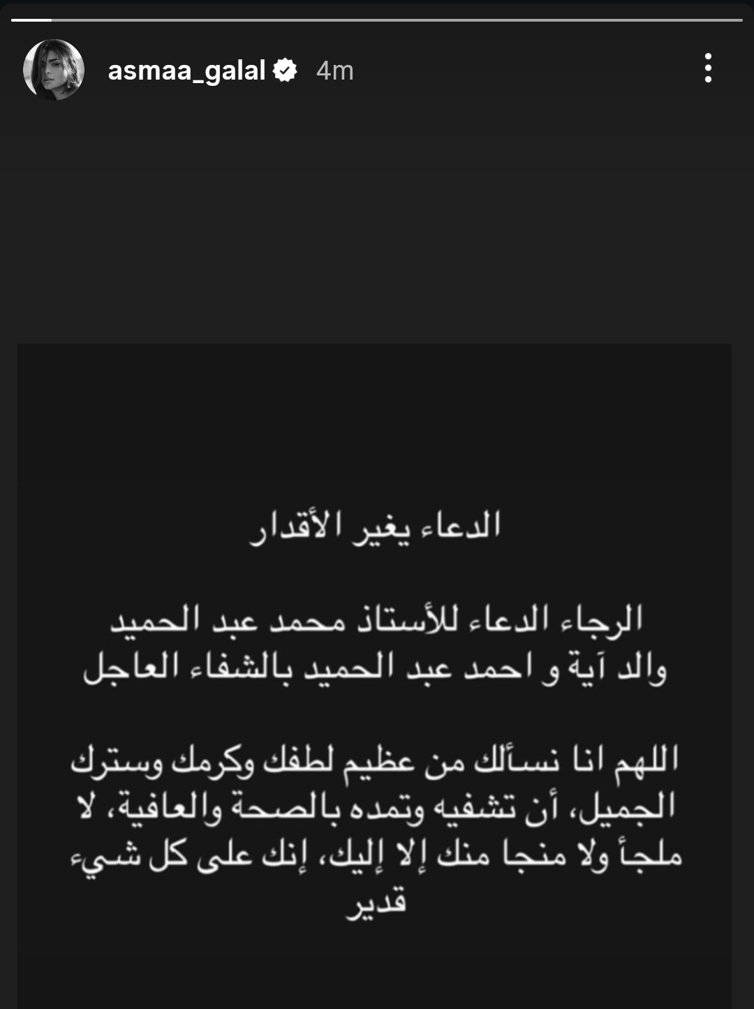 ونشرت الفنانة أسماء جلال عبر حساباتها على مواقع التواصل الاجتماعي دعاءً مؤثرًا، دعت فيه بالشفاء العاجل للأستاذ محمد عبد الحميد، والد الفنان أحمد عبد الحميد وشقيقته آية، قائلة: “اللهم إنا نسألك من عظيم لطفك وكرمك وسترك الجميل أن تشفيه وتمده بالصحة والعافية، لا ملجأ ولا منجا منك إلا إليك، إنك على كل شيء قدير”، وهو المنشور الذي لاقى تفاعلًا واسعًا من المتابعين وعدد كبير من نجوم الفن، الذين شاركوها الدعاء وتمنوا له الشفاء العاجل.