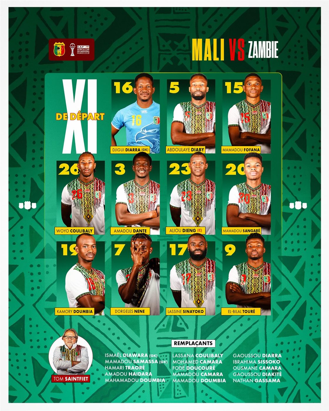 وأعلن المدرب البلجيكي توم سينتفيت، المدير الفني لمنتخب مالي، التشكيل الرسمي الذي سيخوض به اللقاء، والذي شهد توازنًا واضحًا بين الدفاع والهجوم، مع الاعتماد على عناصر قادرة على تنفيذ فكره التكتيكي.
