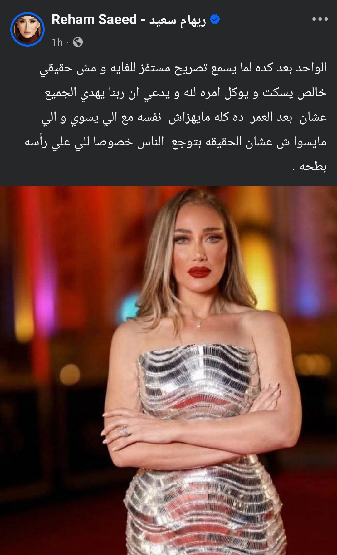 وجاء هذا التوضيح بعد حالة من اللغط أثارتها منشورات منسوبة إليها على مواقع التواصل الاجتماعي رصدها موقع تحيا مصر، وتضمنت هجومًا على الفنان أحمد العوضي، وهو ما دفعها للخروج عن صمتها وتوضيح الصورة، وكانت ريهام سعيد قد نشرت في وقت سابق رسالة شديدة اللهجة عبر حسابها الرسمي على فيسبوك، تحدثت فيها بشكل عام عن فكرة «رد الجميل»، دون أن تسمي شخصًا بعينه، حيث كتبت: «طب رد الجميل للي خلي الناس تعرفك، رد الجميل للي وقفتك بطل قدامها، رد الجميل للي عملت لك أجر.. اشكرها لأن لولاها مكنش ده حصل، ربنا جعلها سبب كبير»، هذه الرسالة فُسرت من قبل البعض على أنها موجهة بشكل مباشر إلى أحمد العوضي، خاصة في ظل تصريحات متداولة عنه، ما فتح باب التأويلات وربط الأحداث ببعضها، وأشعل موجة من التعليقات والانتقادات عبر السوشيال ميديا.