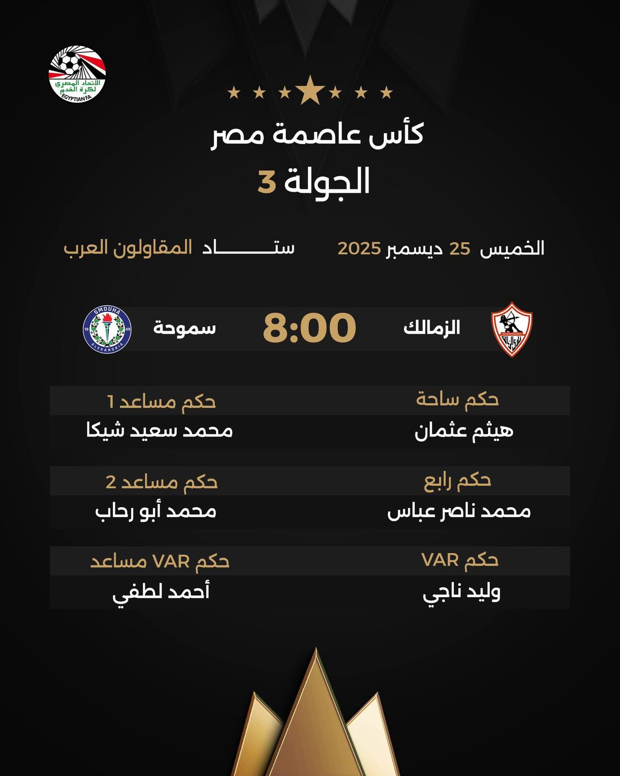 طاقم تحكيم مباراة الزمالك وسموحة في كأس عاصمة مصر