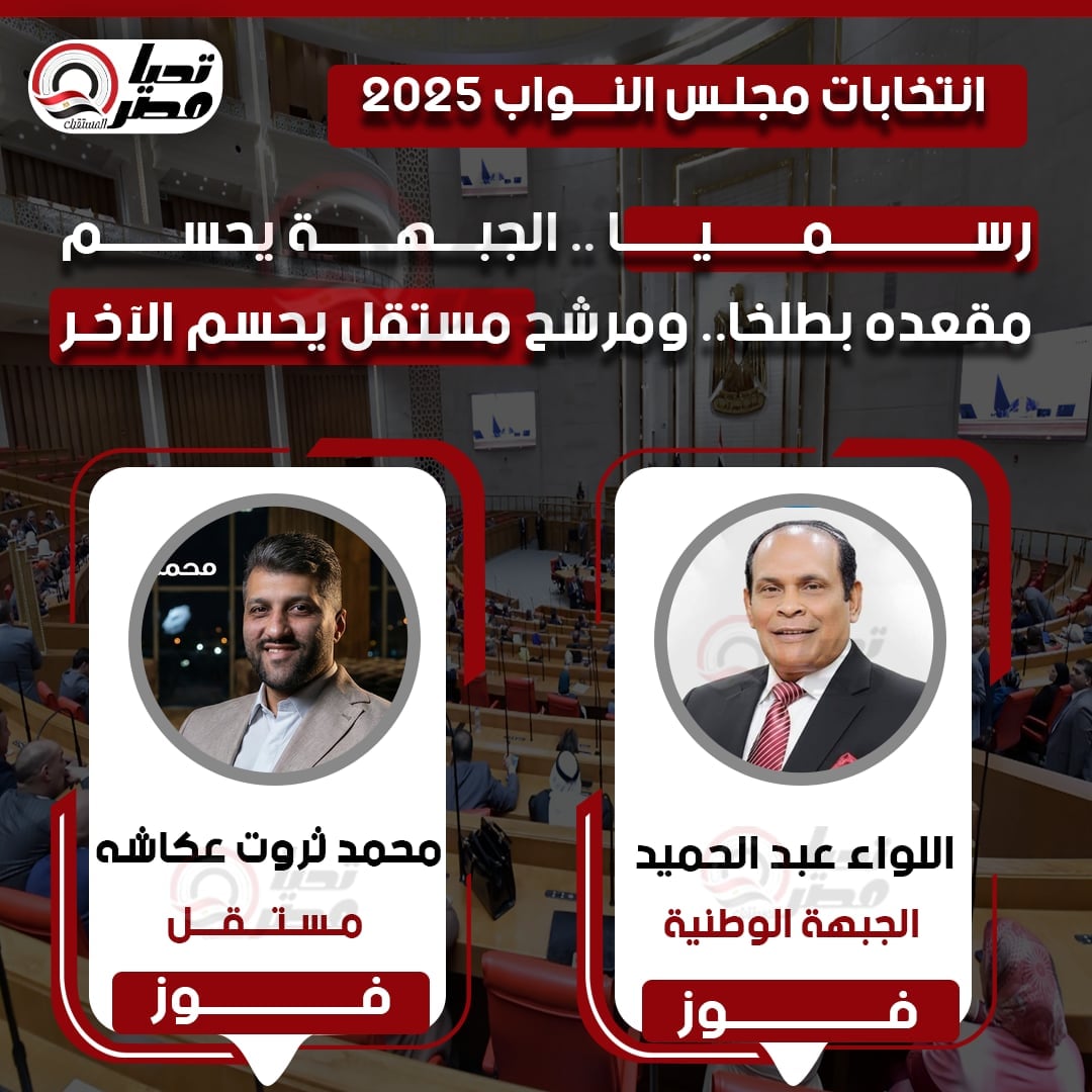أعلن القاضي حازم بدوي رئيس الهيئة الوطنية للانتخابات عن فوز اللواء عبد الحميد مرشح حزب الجبهة الوطنية، والمرشح المستقل محمد ثروت عكاشة، بمقعدي مجلس النواب بالفصل التشريعي الثالث بدائرة طلخا في محافظة الدقهلية