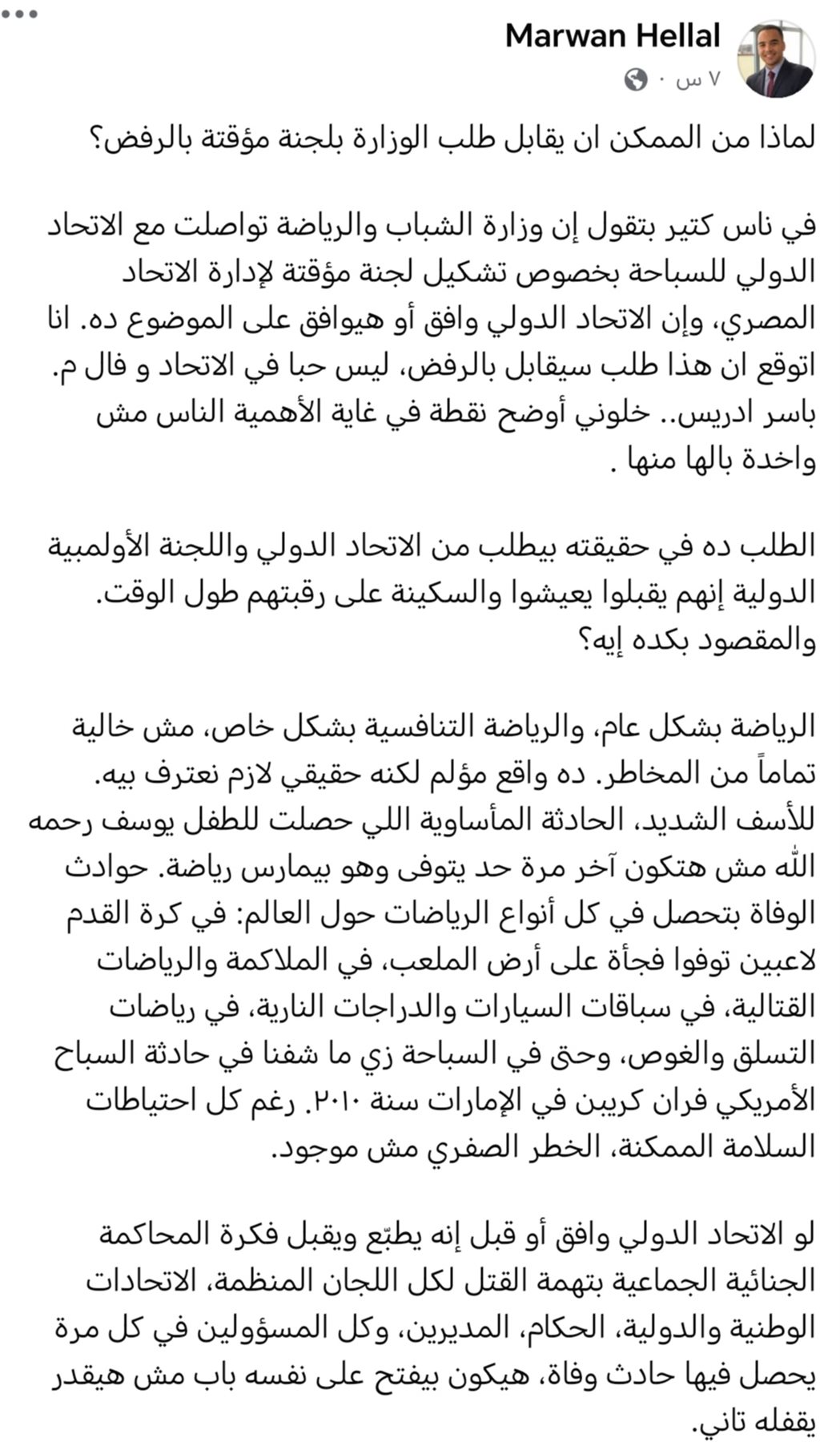 نشر الدكتور مروان هلال، الاستاذ المساعد في الدراسات الاولمبية واخلاقيات الرياضة بجامعة ويسترن الكندية وعضو مجلس ادارة المركز الدولي للدراسات الاولمبية في كندا، والسباح السابق بالمنتخب الوطني المصري لمرحلة العمومي خلال الفترة من 2010 الى 2015، عبر صفحته الرسمية على موقع فيسبوك، تعليقا تناول فيه الجدل الدائر حول امكانية تشكيل لجنة مؤقتة لادارة الاتحاد المصري للسباحة، ويستعرض تحيا مصر التفاصيل.