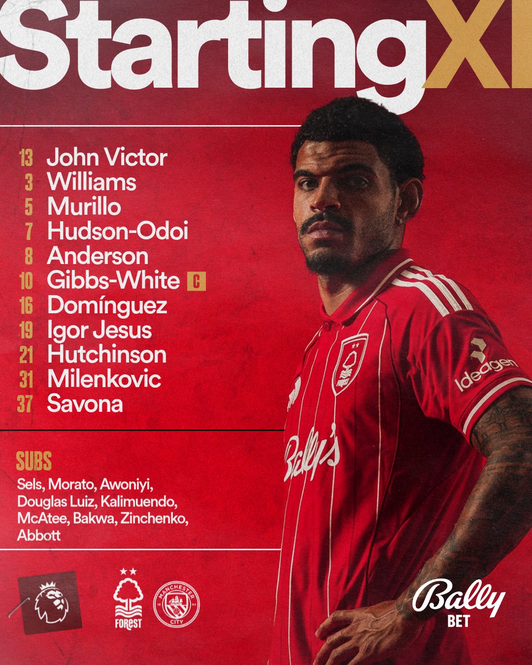 في المقابل، يدخل نوتينجهام فورست المباراة بتشكيل يضم جون فيكتور في حراسة المرمى، وأمامه ويليامز، مورييو، ميلينكوفيتش وسافونا في الخط الخلفي، بينما يعتمد الفريق على تحركات جيبس وايت وهودسون أودوي في صناعة اللعب، مع محاولة استغلال الهجمات المرتدة أمام الضغط المتوقع من السيتي.
