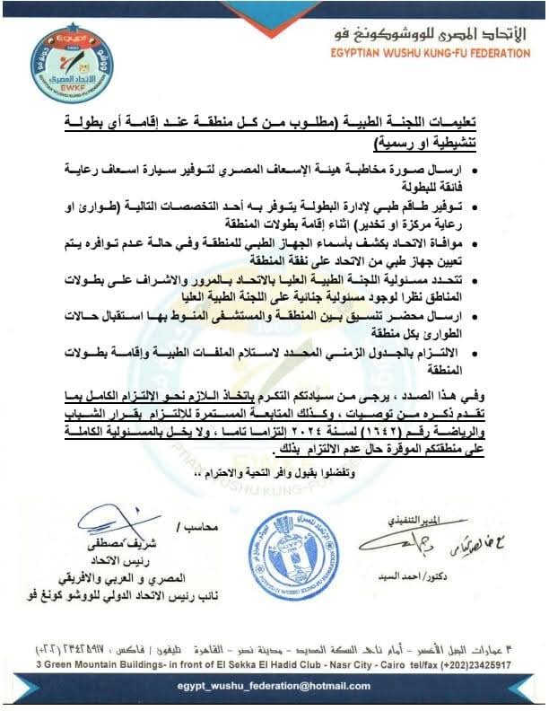 وشدد الاتحاد المصري للووشو كونغ فو على أنه يحظر على المناطق إقامة بطولات تنشيطية أو رسمية إلا بعد الحصول على موافقة كتابية من المدير التنفيذي للاتحاد، وذلك عقب مراجعة اللجنة الطبية العليا للملفات الطبية للاعبين وإصدار موافقة صريحة بكون الملفات مستوفاة أو غير مستوفاة.