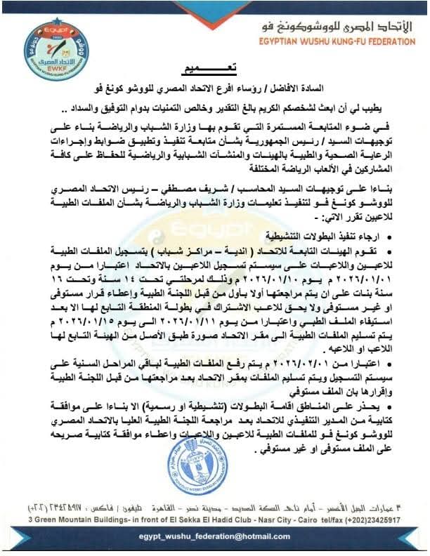 أرسل الاتحاد المصري للووشو كونغ فو برئاسة المحاسب شريف مصطفى تعميما إلى رؤساء فروع الاتحاد المصري للووشو كونغ فو، أكد خلاله على أهمية الالتزام التام بضوابط الرعاية الصحية والطبية للاعبين، ويستعرض تحيا مصر التفاصيل.