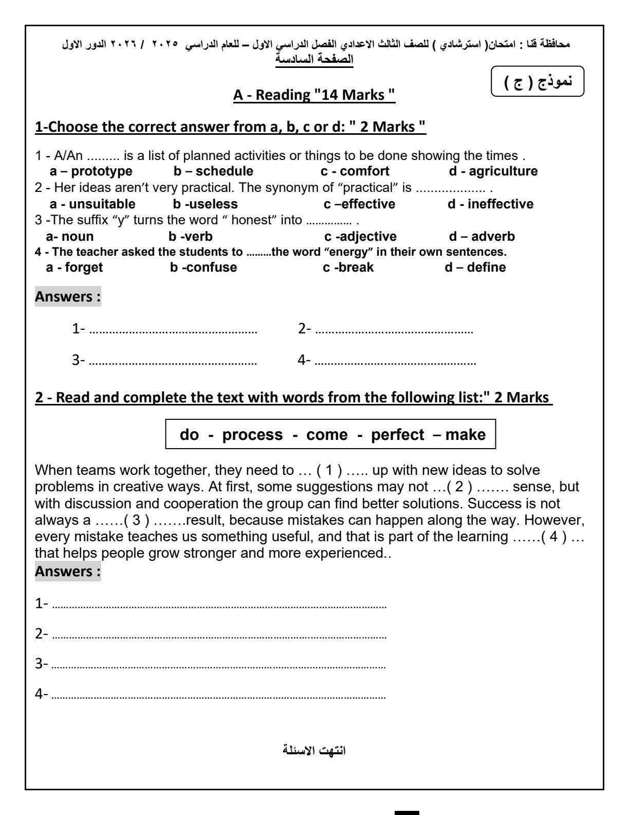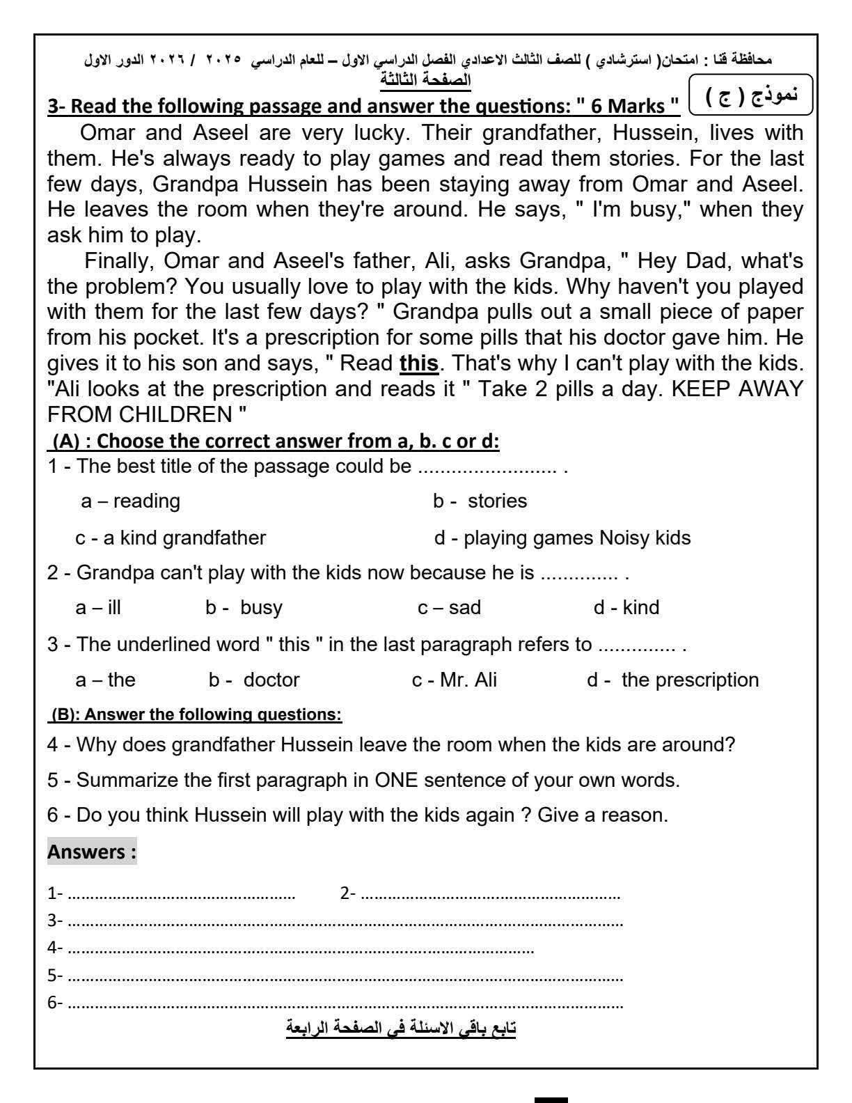 النموذج الاسترشادي لطلاب الصف الثالث الإعدادي بمحافظة قنا