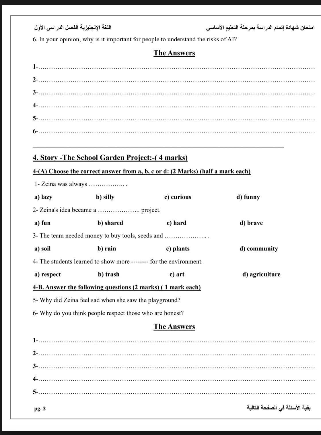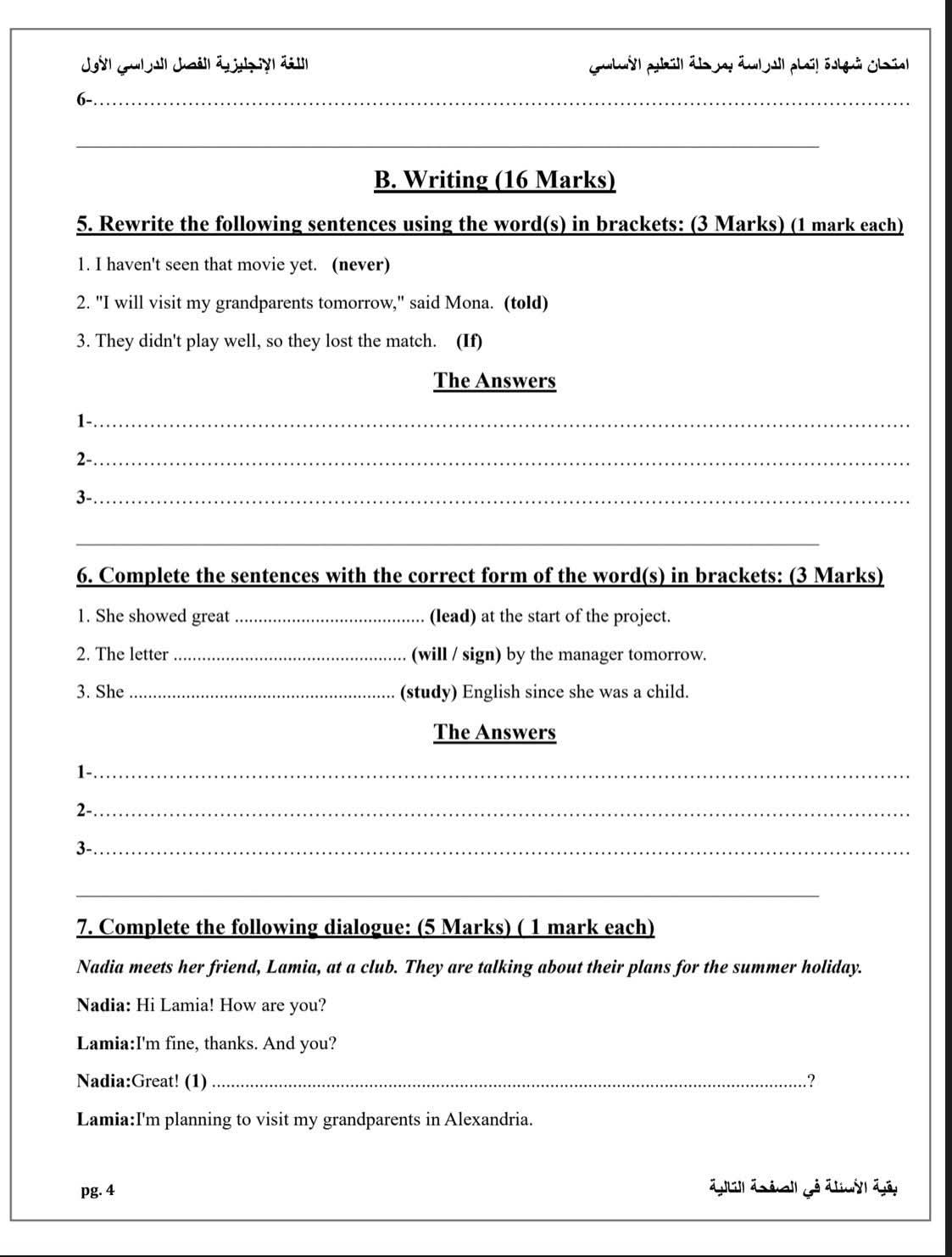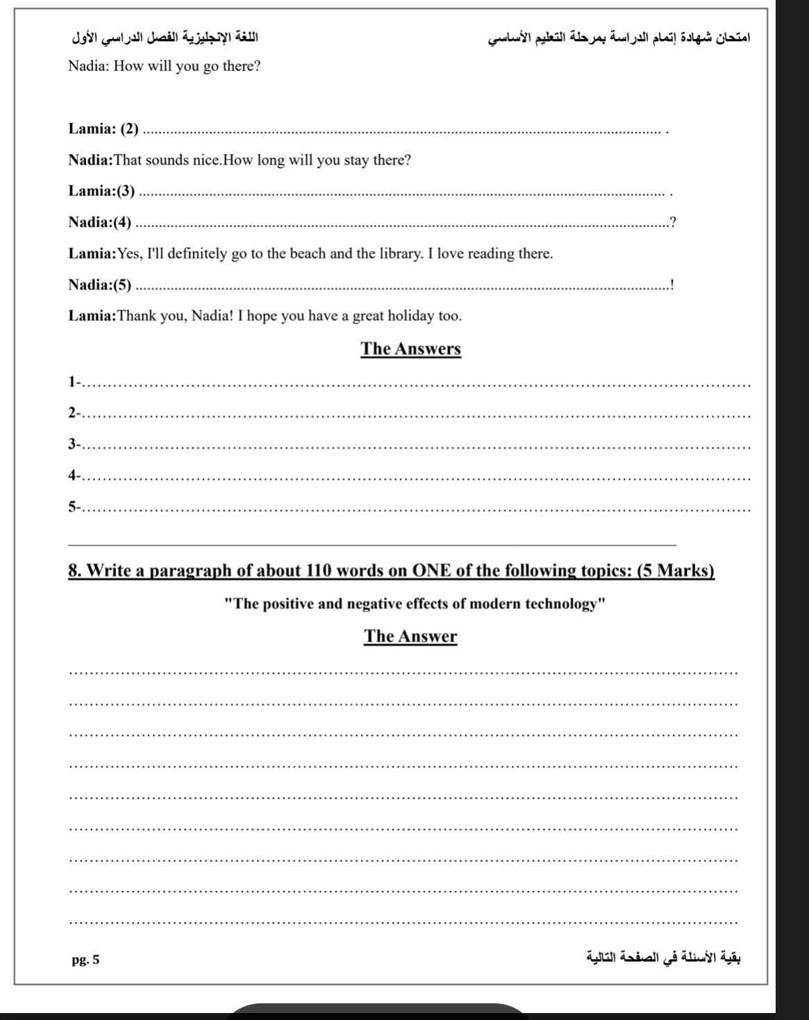 - الورقة الامتحانية