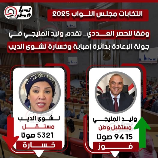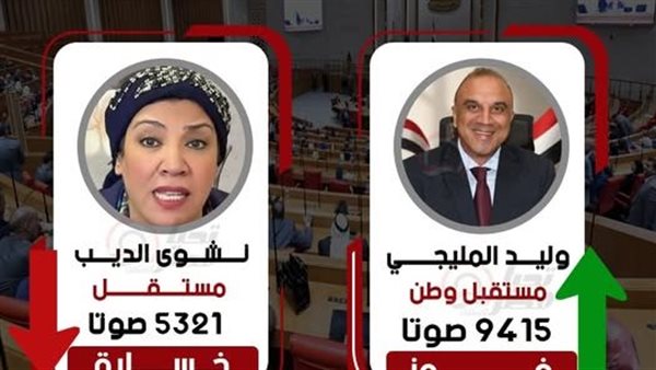 حصل مرشح حزب مستقبل وطن وليد المليجي على 9415 صوتا من أصل 14746 صوتا صحيحًا، بينما حصلت المرشحة المستقلة نشوى الديب على 5325 صوتا، وتؤكد المؤشرات الأولية فوز مرشح حزب مستقبل وطن أمام المرشحة نشوى الديب.