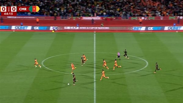 ومن جديد تمنع العارضة كريستيان كوفاني لاعب الكاميرون من تسجيل الهدف الأول في المباراة وتتعاطف العارضة مع الإيفواريين.