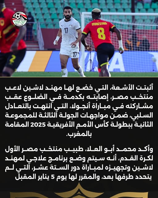 ويُعد مهند لاشين من العناصر المهمة في صفوف منتخب مصر، نظرًا لدوره المؤثر في وسط الملعب وقدرته على الربط بين الدفاع والهجوم، وهو ما جعل الجهاز الفني حريصًا على متابعته طبيًا خلال الساعات الماضية، خاصة بعد الأداء البدني القوي الذي قدمه أمام منتخب أنجولا.